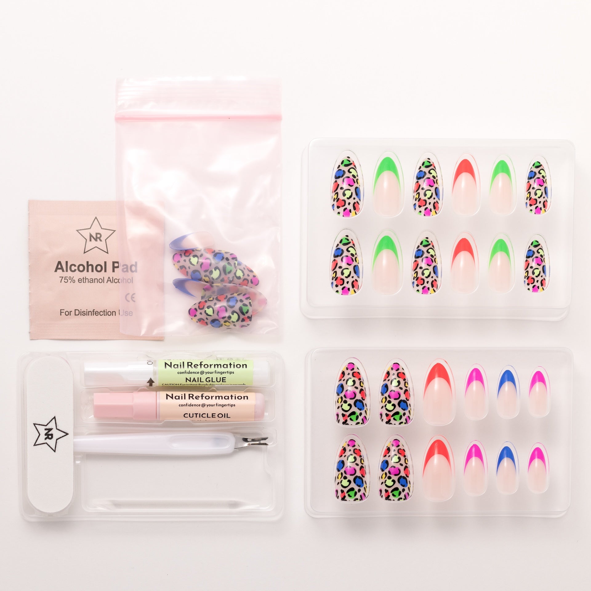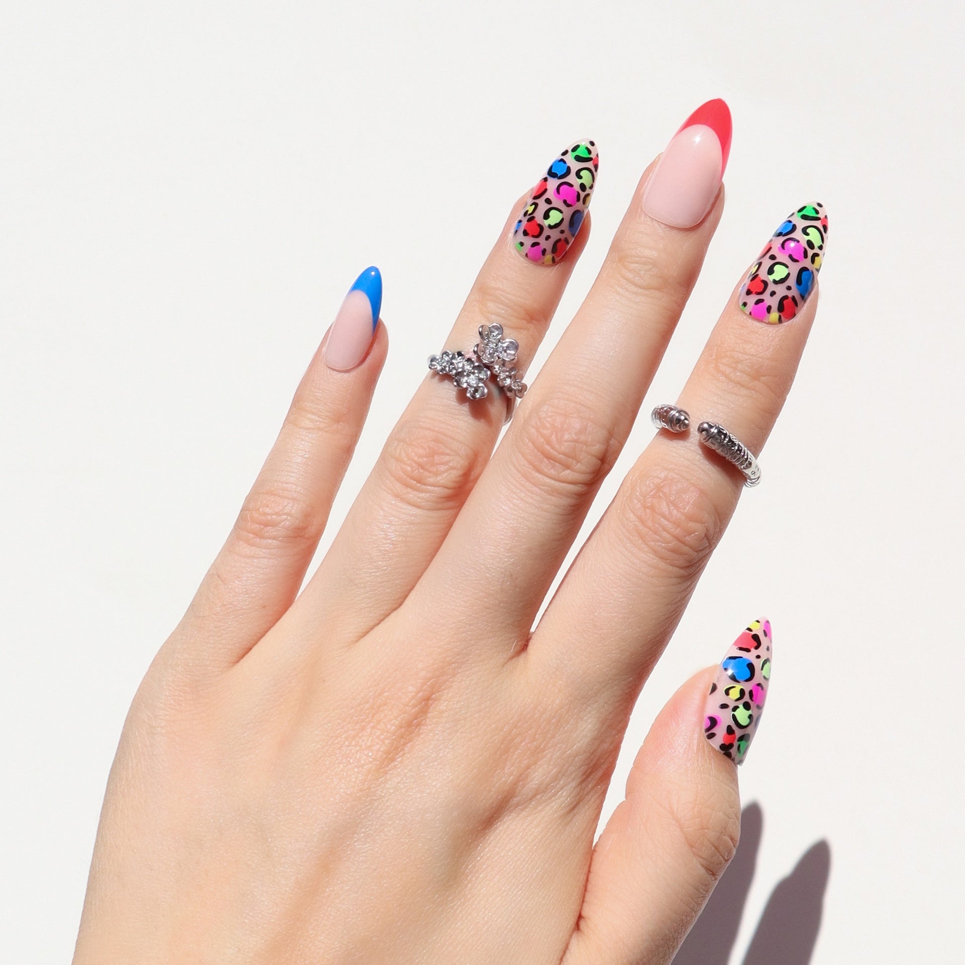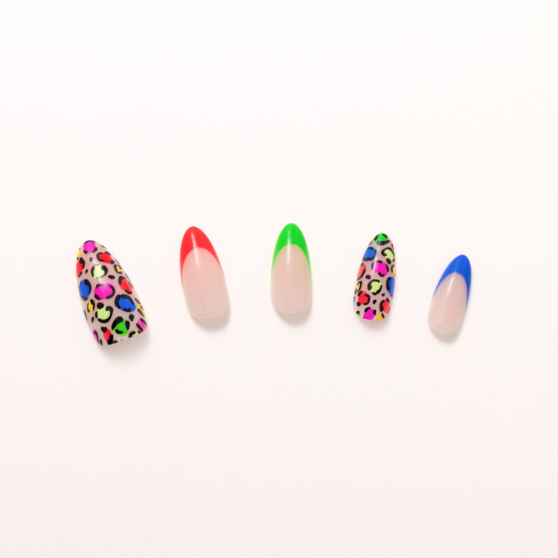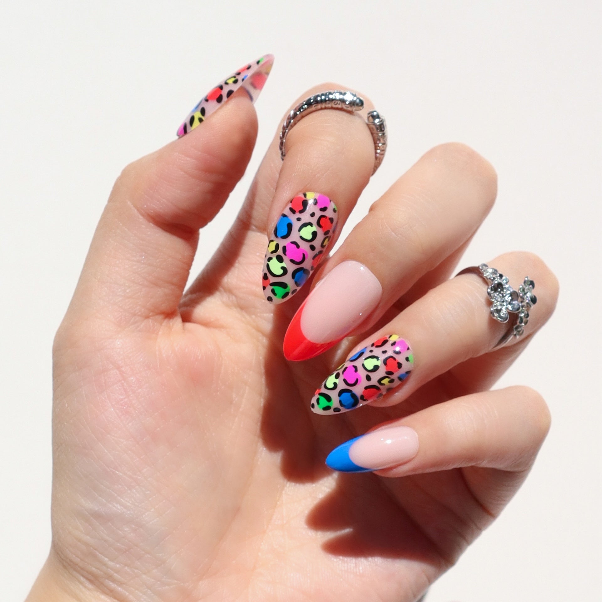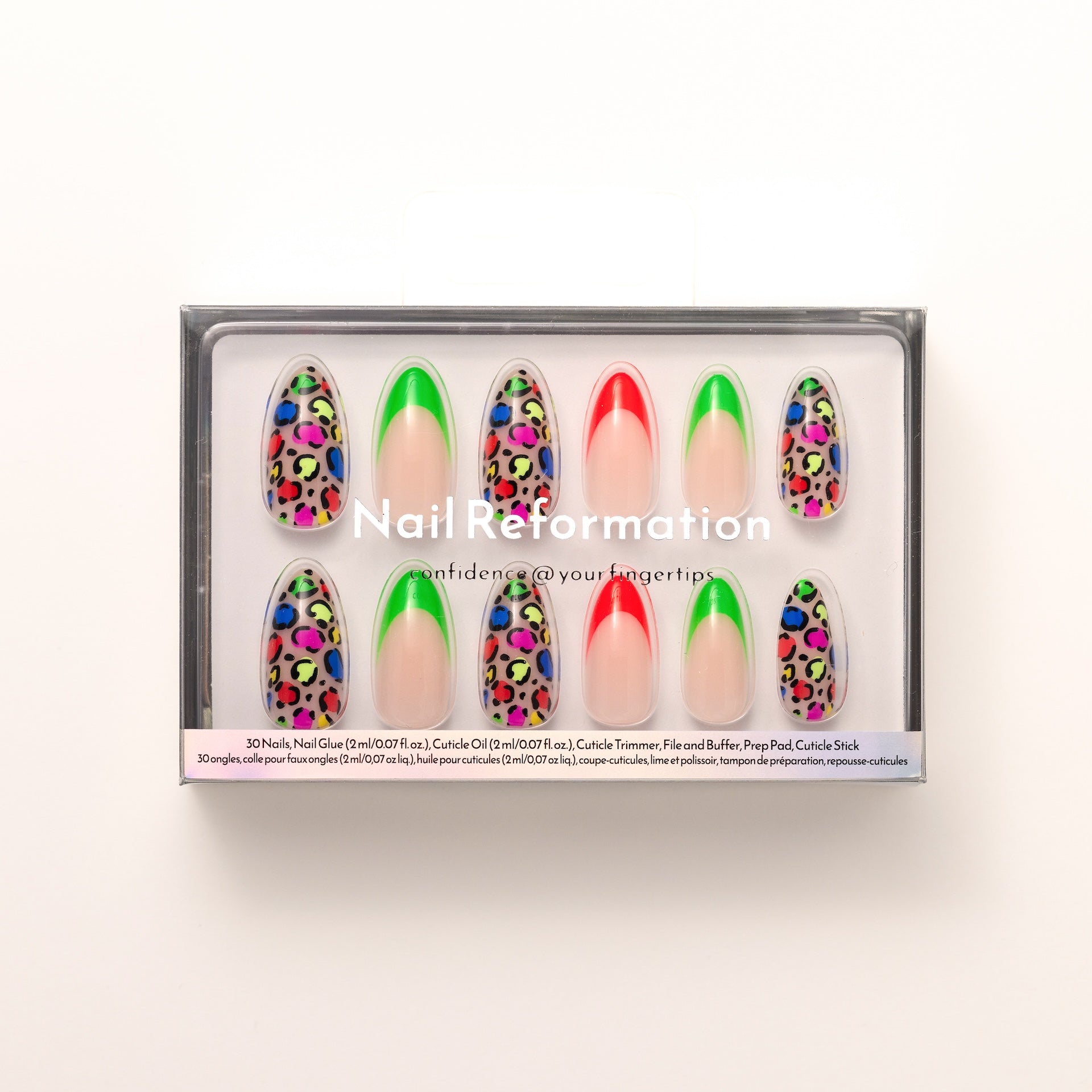 Instinctively fierce. The Animal Instincts press-ons channel untamed energy with rainbow leopard print and sharp French tips in electric red. green. pink. and cobalt. A glossy nude base keeps it clean. while sculpted medium almond shaping adds just the right edge. Finished with a high-shine effect layer. this set doesn’t follow trends—it hunts them.