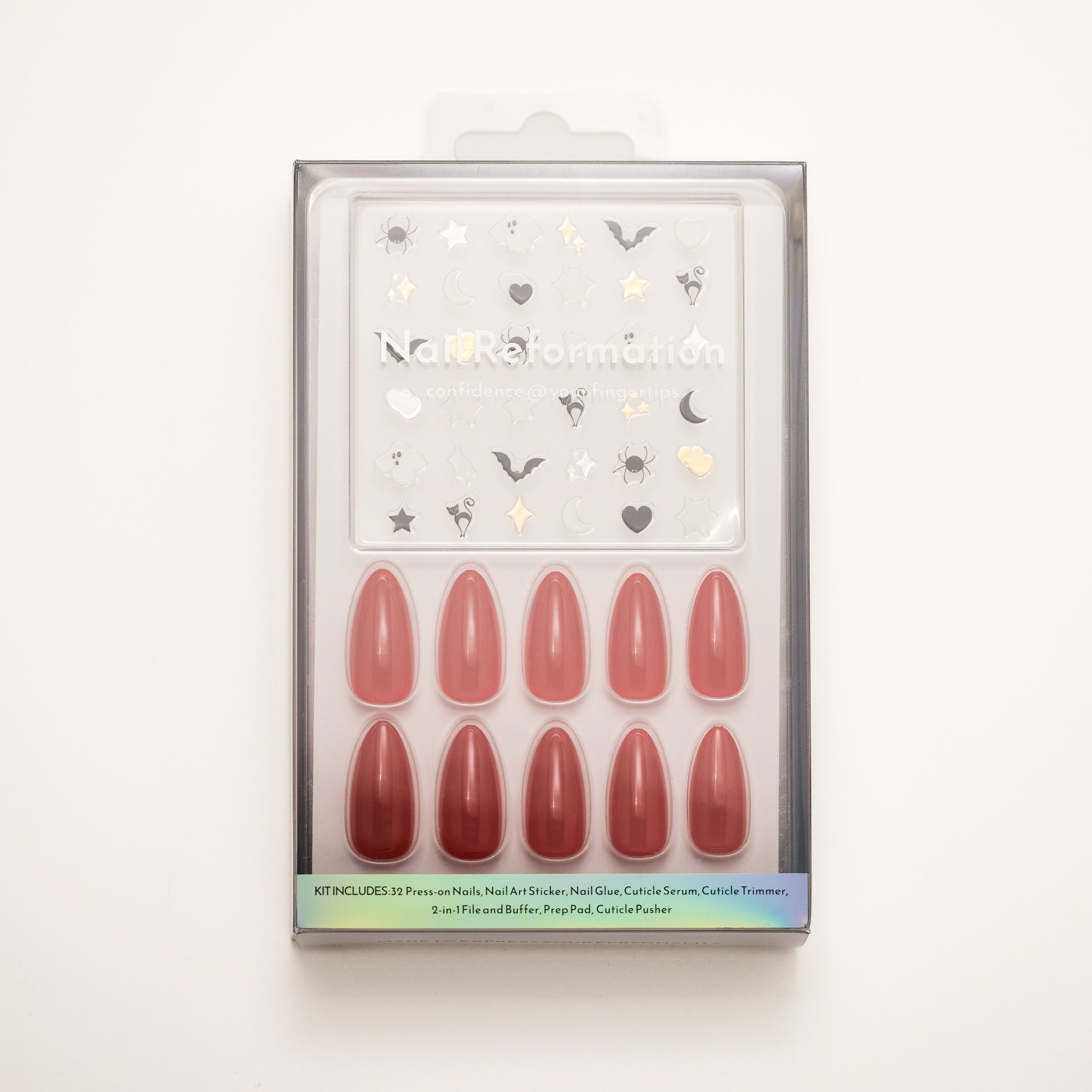 Quench your thirst for spooky style with the Bad Blood press-on nail set. These medium. almond-shaped glossy nails in a rich. blood-red hue add a blood-curdling touch to your Halloween look. Perfect for a night of fright. these nails bring out the gruesome glamor in any costume. cause now you’ve got Bad Blood.