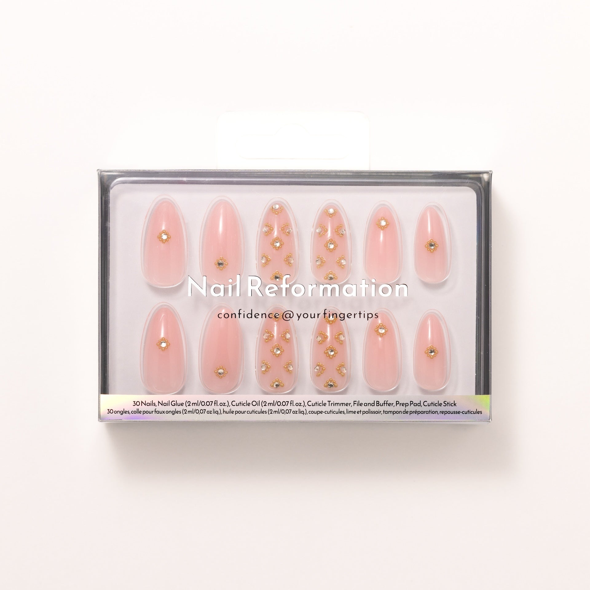 The Bejeweled medium almond press-ons transform a soft nude base into something extraordinary with delicate crystal accents that sparkle like scattered gems. Each jewel adds dimension and brilliance. turning fingertips into accessories as polished as fine jewelry. A glossy glaze enhances the radiance. while the almond silhouette keeps the look elegant and wearable. This design proves that even the simplest manicure becomes unforgettable when it’s dressed in diamonds.