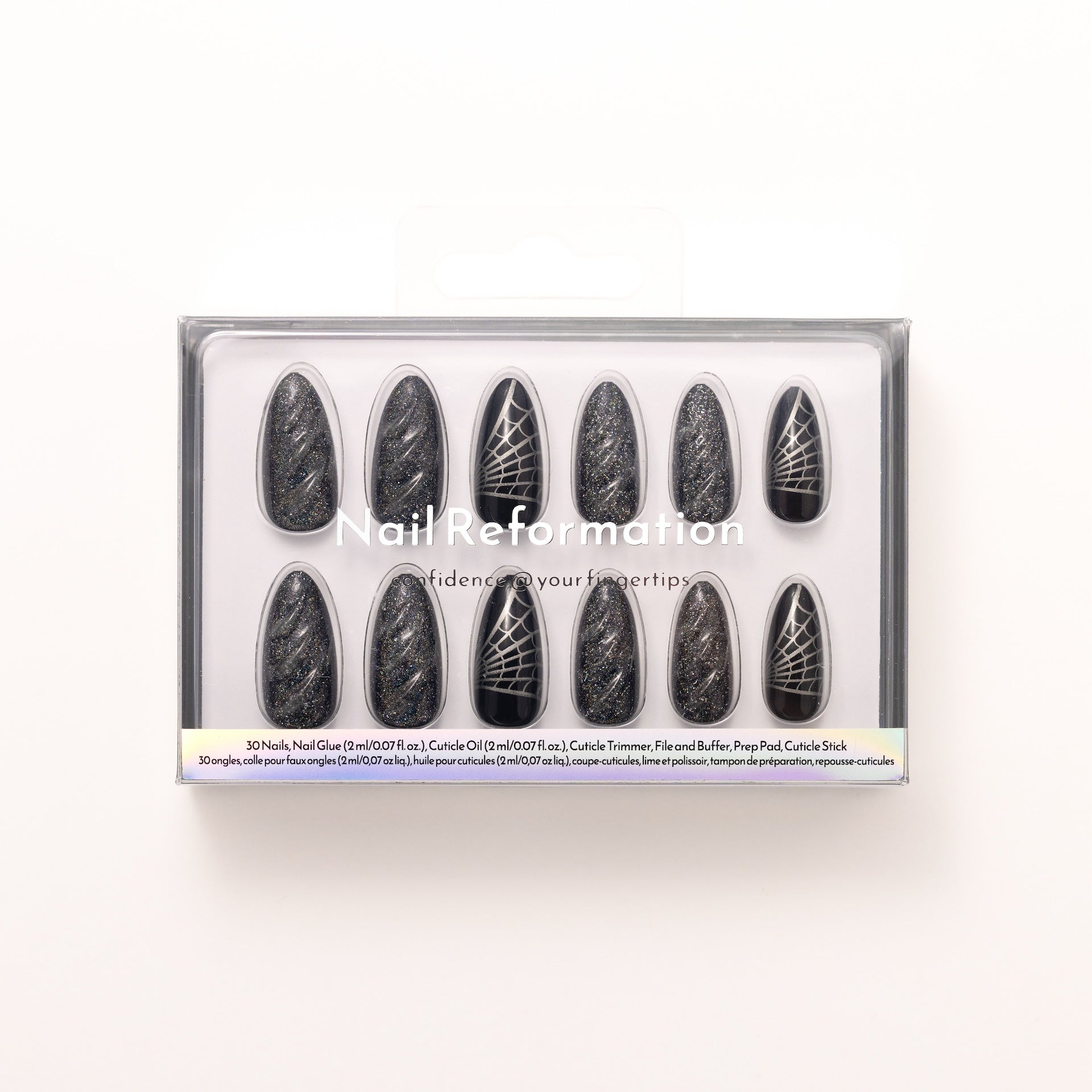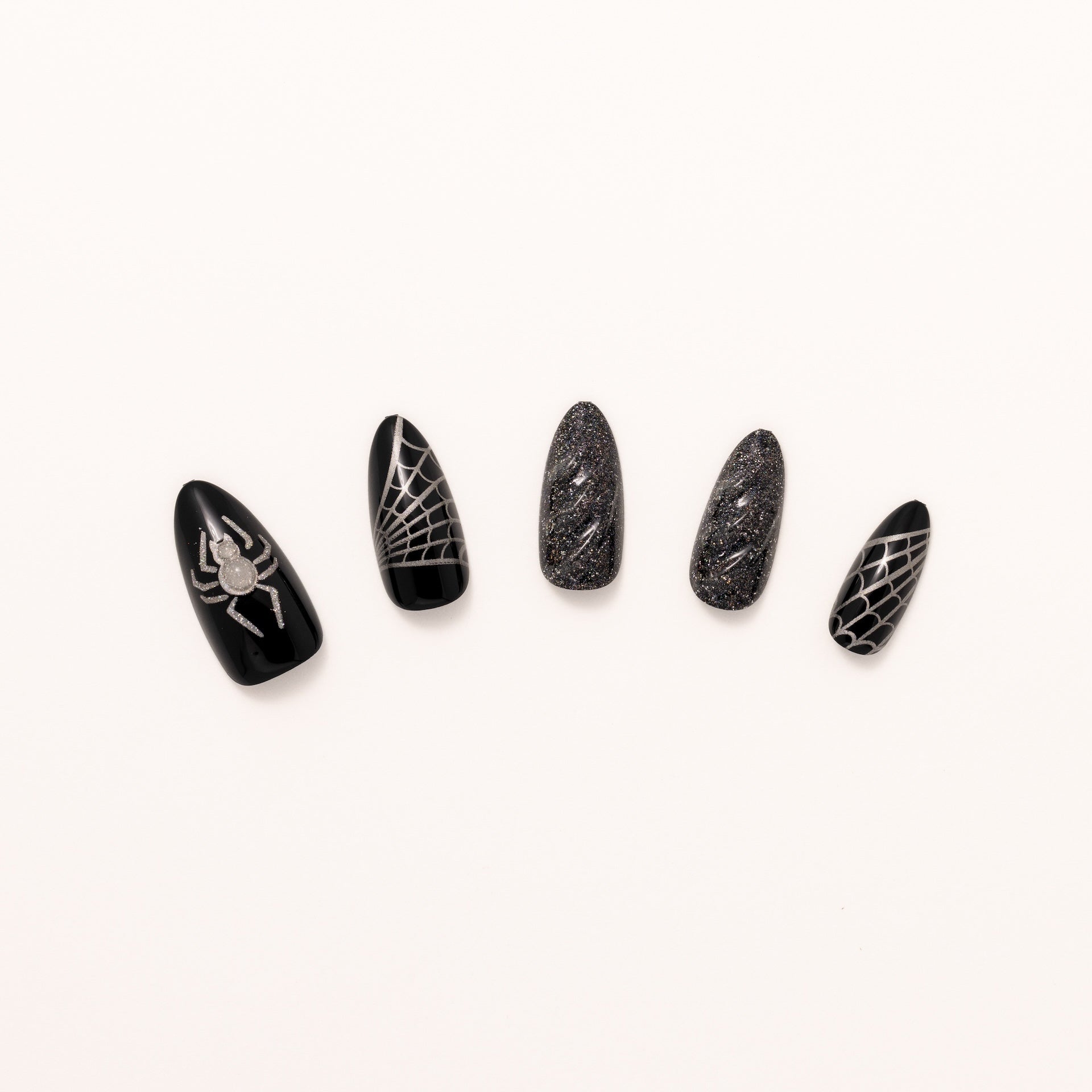 The Black Widow medium almond press-on nails wrap your fingertips in jet-black shimmer with glitter-lined spider web accents and a tiny black widow charm ready to strike. Each nail spins together elegance and edge. catching light like silk and attention like prey. Whether you’re toasting or texting. they stay woven into every gaze. With nails this slick. the trap sets itself.