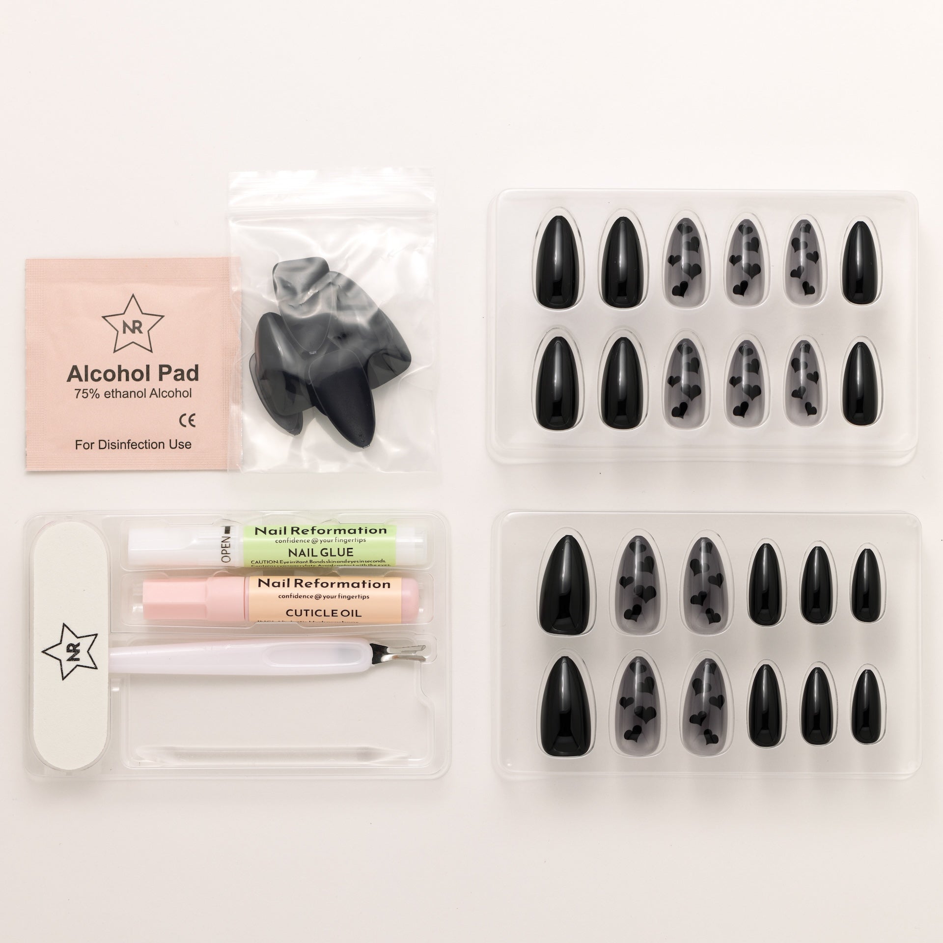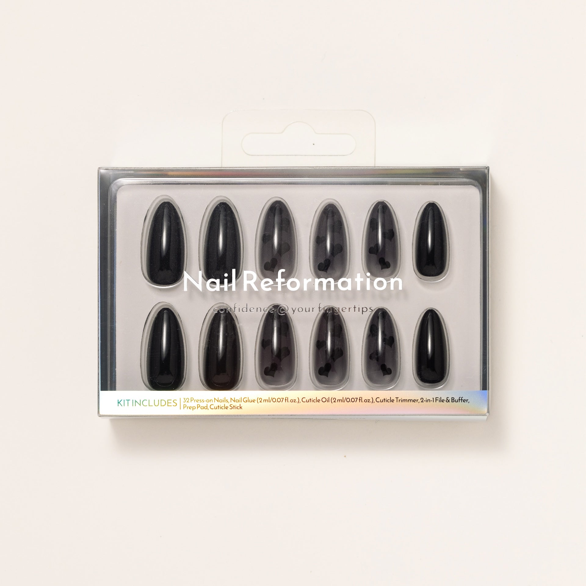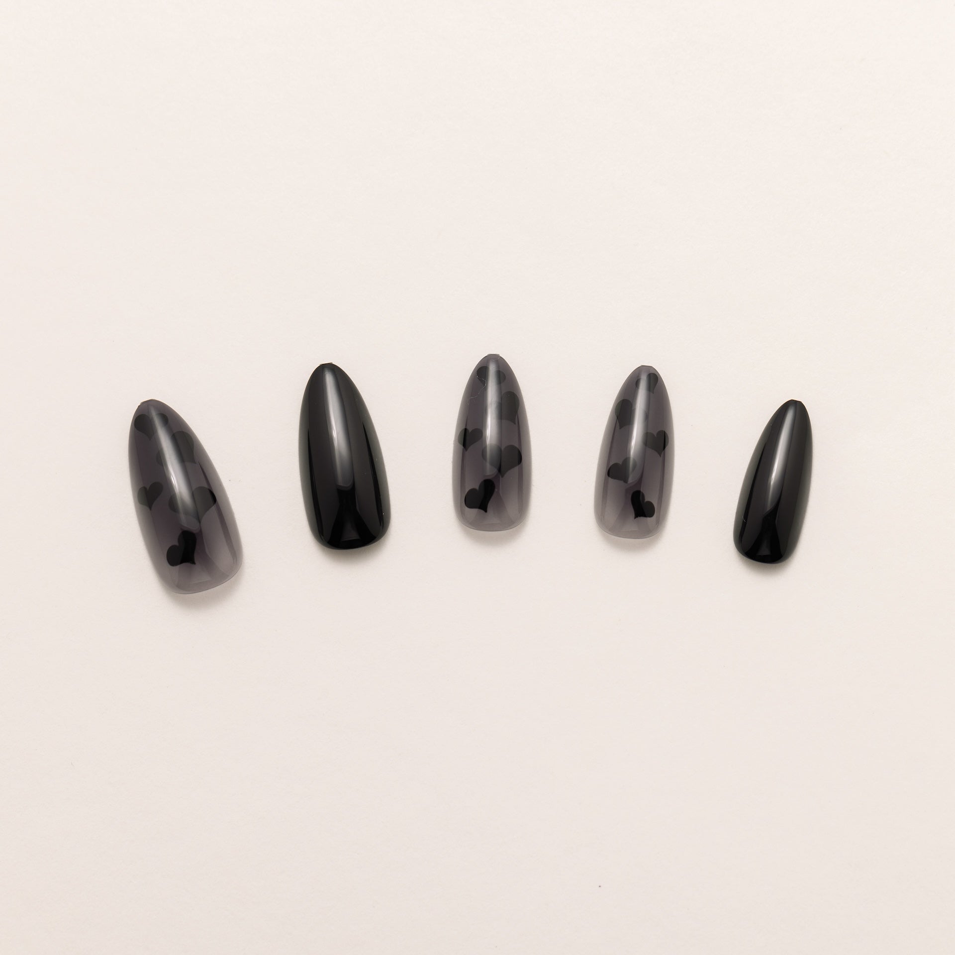 Put your Heart & Soul into every look. These press-on nails blend rich black and transparent tones with playful heart accents. adding a dash of romance to a classic palette. Perfect for date nights. casual outings. or simply when you want to wear your heart on your nails. Heart & Soul nails bring a charming touch to any occasion.