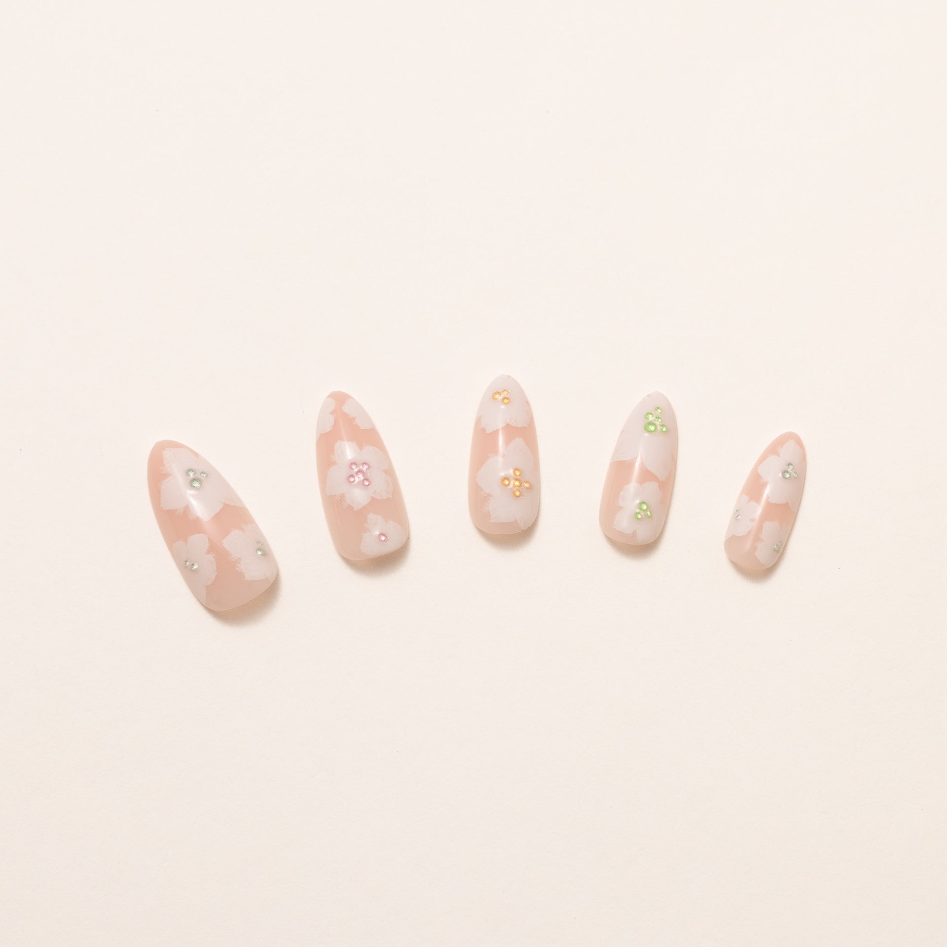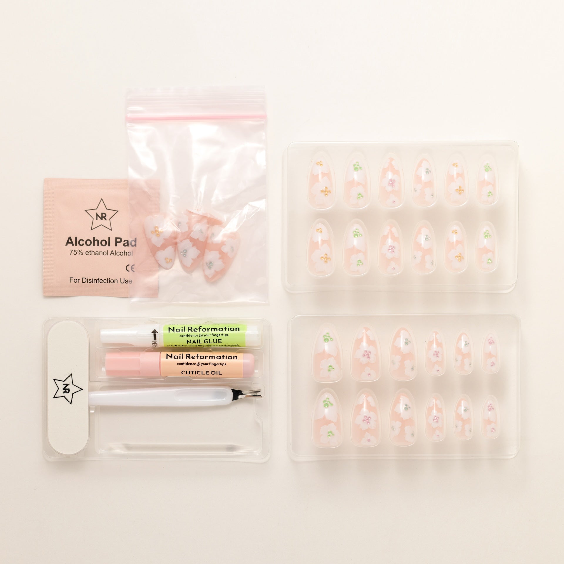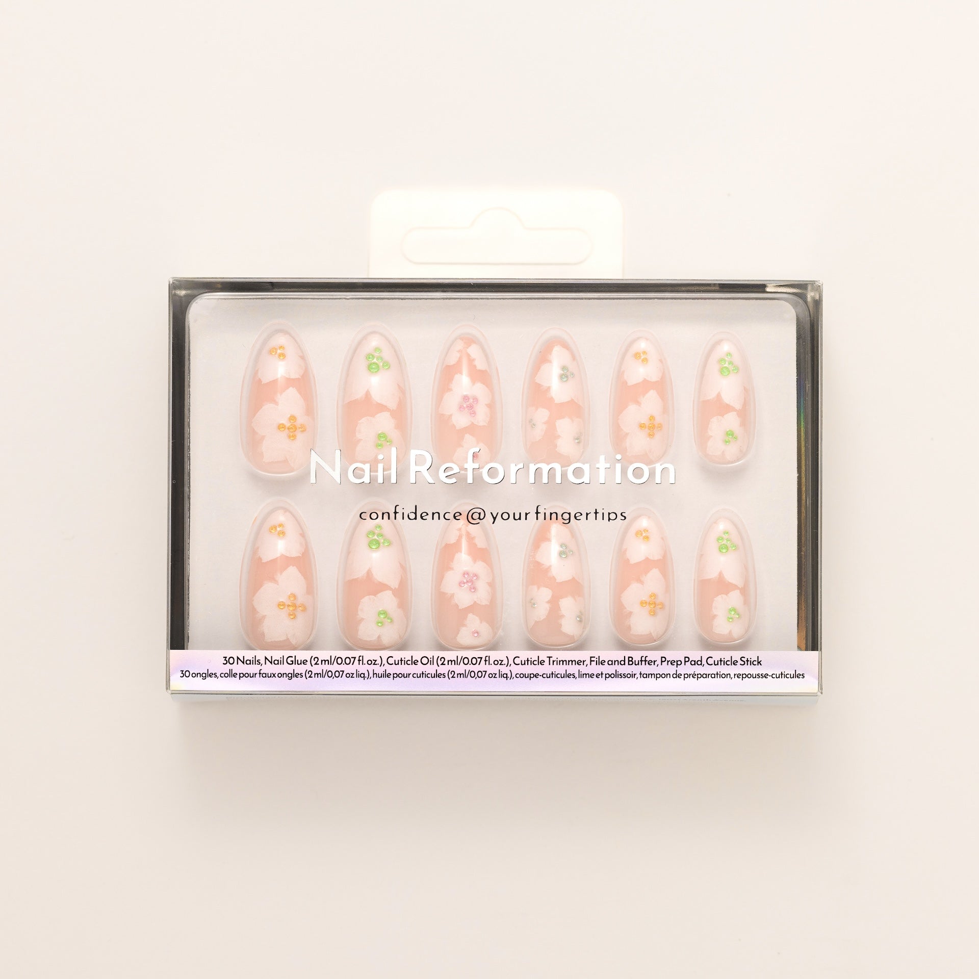 A floral finish that’s as clear as day. Hibiscus Haze brings effortless elegance to minimalist floral nails. blending sheer white petals with dewy gemstone centers that catch the light. Set against a soft. neutral base. this design is a fresh take on delicate florals. perfect for those who love a touch of refinement with a hint of shimmer. The medium almond shape provides a naturally polished look. making these press-ons as timeless as they are luminous.