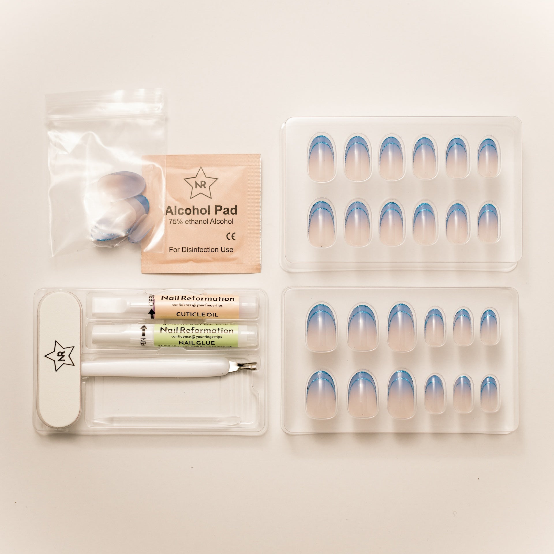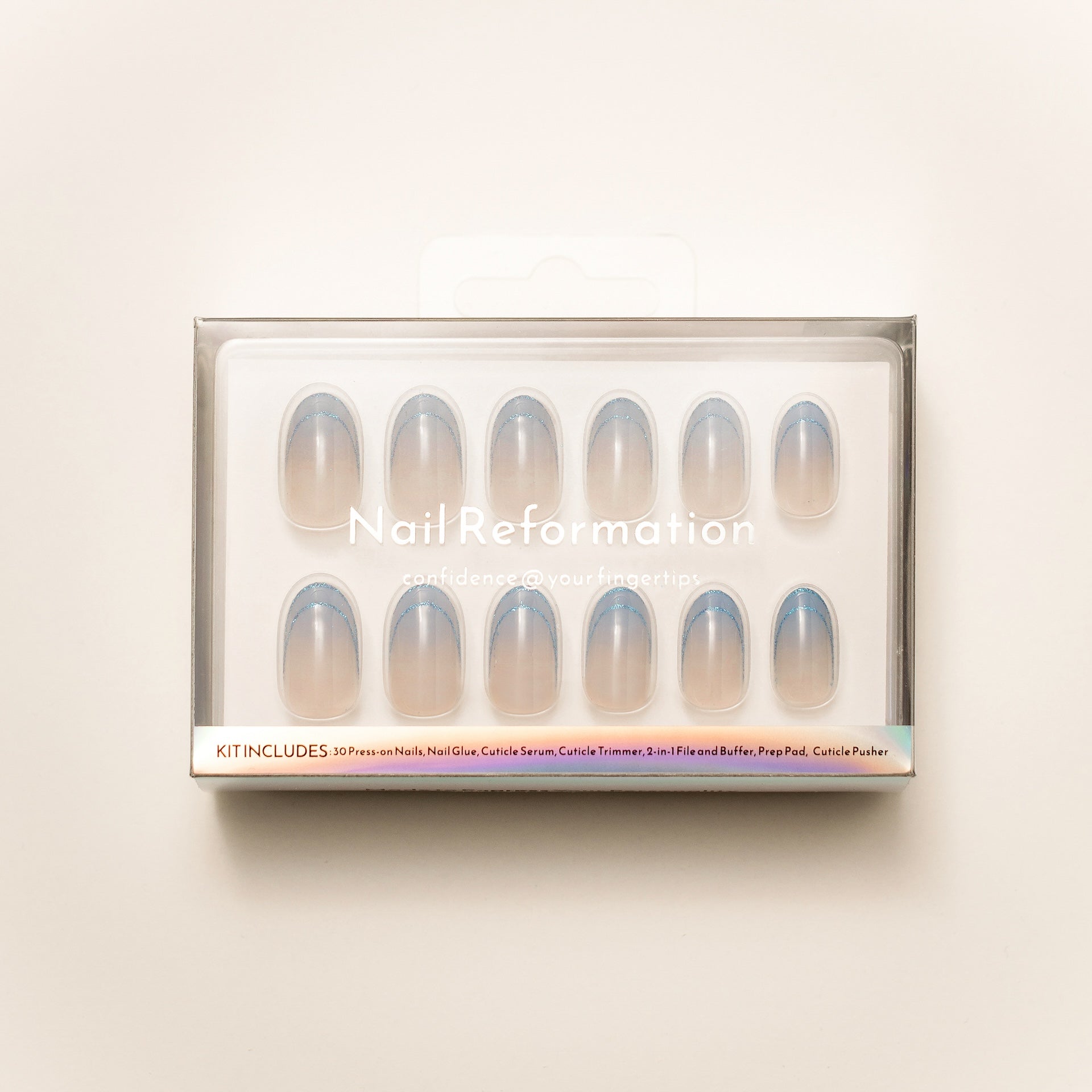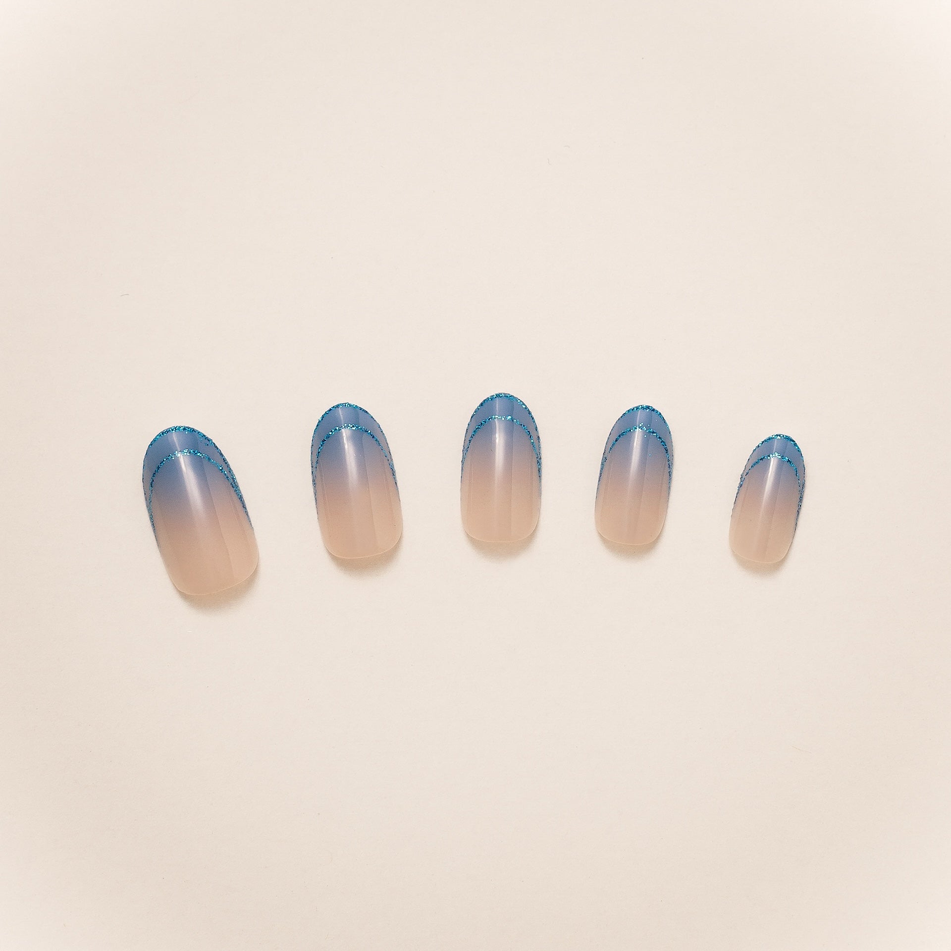 Make a bold statement and create ripples with the Make Wave press-on nail set. as ombre French tips and blue glitter stripes embody the dynamic motion of waves on short. round nails. This design is for those who aim to set trends and make a stylistic splash. offering a serene yet striking aesthetic. With Make Wave. your nails. hands. and confidence will not just glimmer—they’ll make waves.