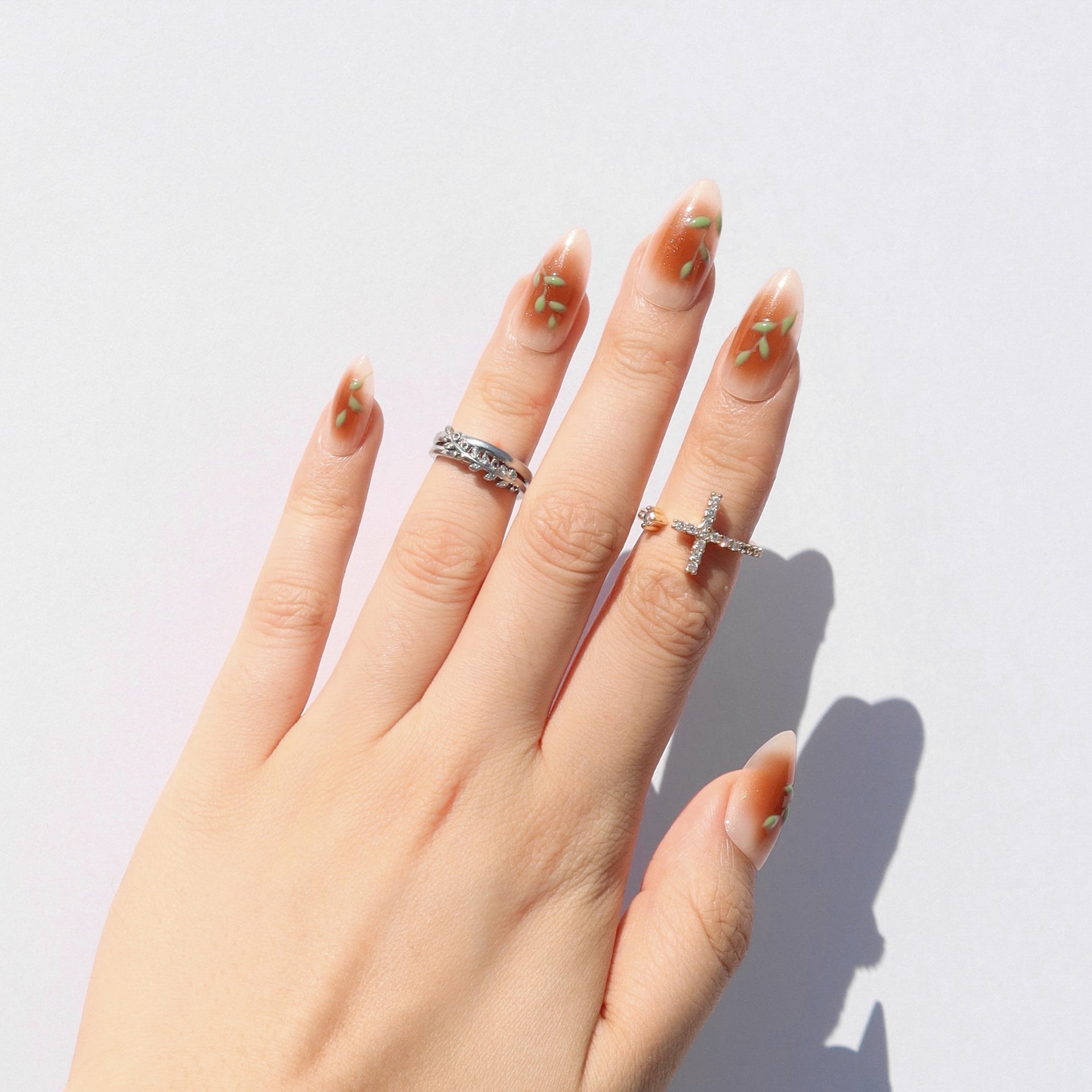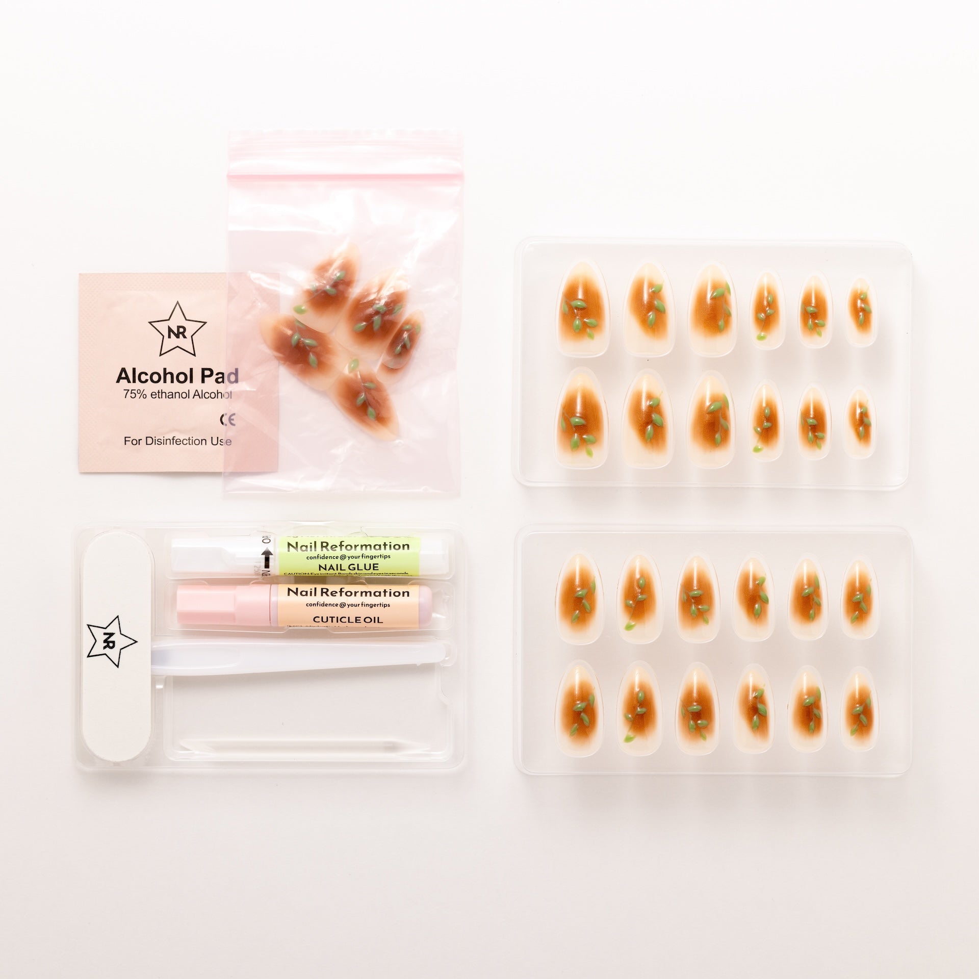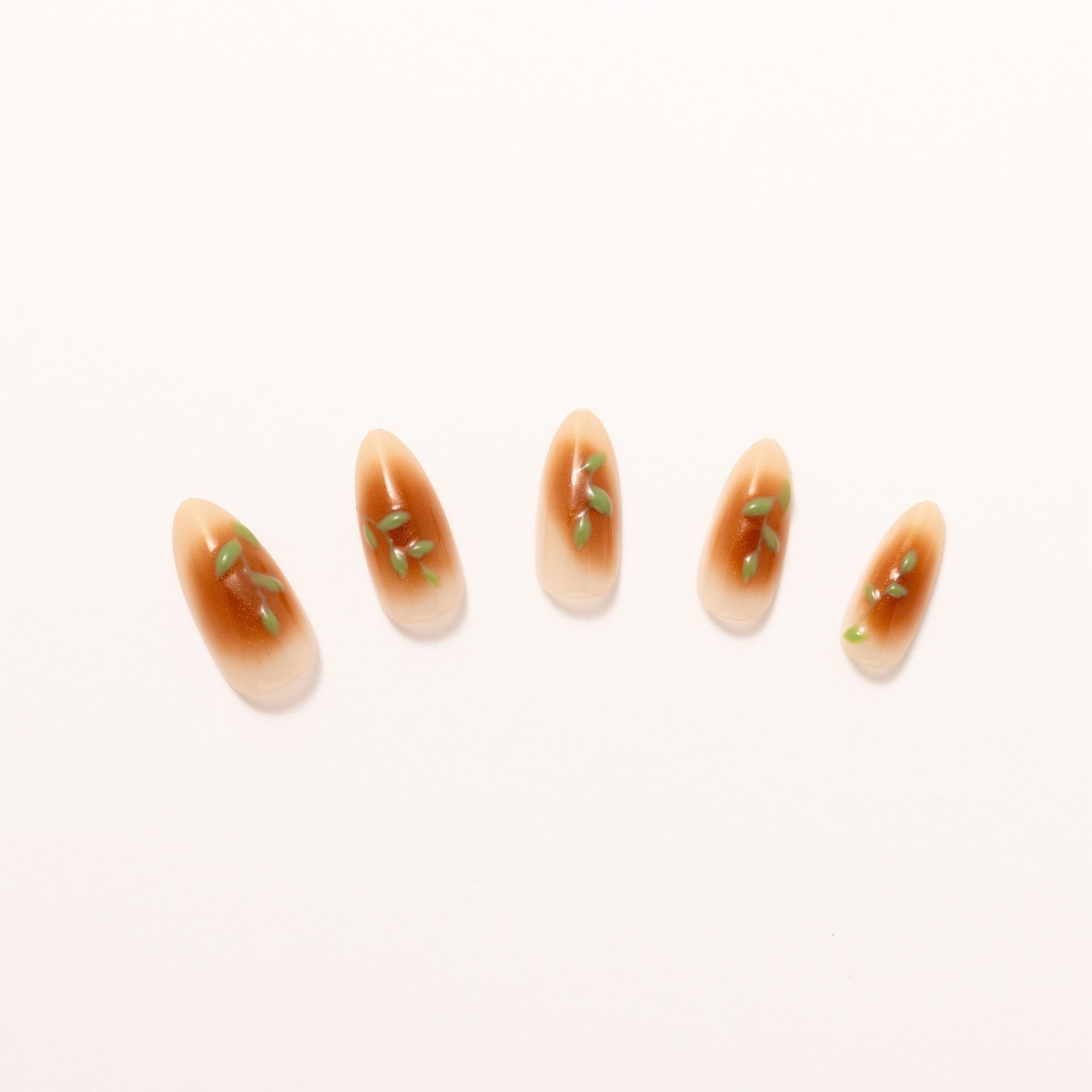 The Maple Leaf press-on nail set layers syrupy brown tones with sheer blush and scattered rose gold foil to mimic the look of melting sugar. Each medium almond nail feels warm and fluid. like a swirl of maple glaze on skin. Finished in a soft-gloss top coat. this set is all about smooth lines and sweet simplicity with just a bit of shimmer.