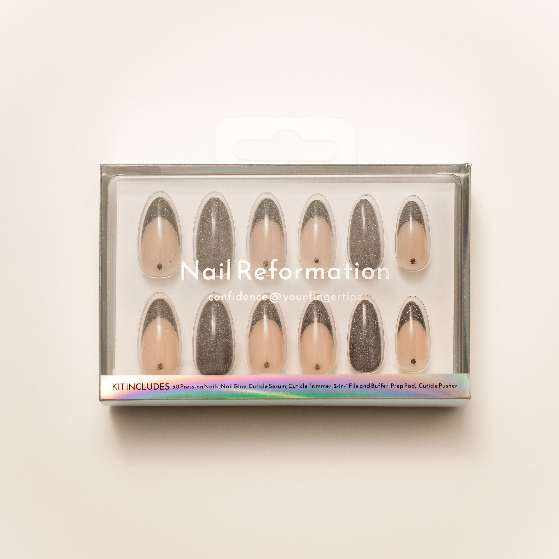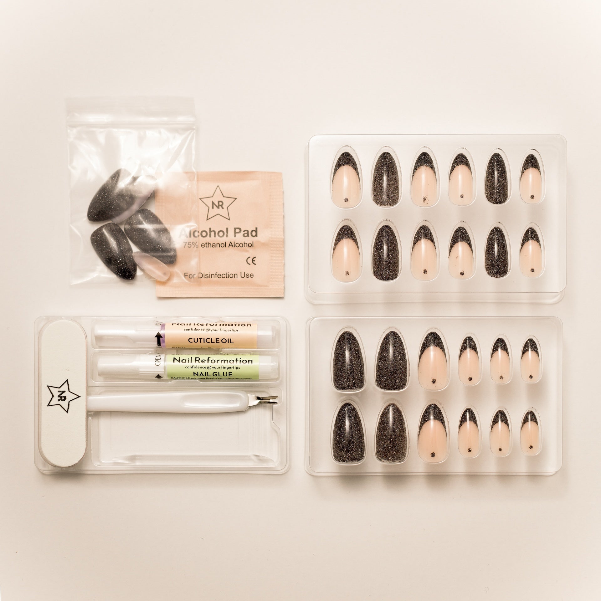 Enter the realm of enchantment with the Midnight Glitter press-on nail set. where these medium. almond-shaped nails will make you sparkle like the night sky with this gorgeous mix of gleaming French tips and black dots. Perfect for those drawn to the night’s mysterious beauty. this set promises to transform every moment into something magical. Midnight Glitter elevates your nails. hands. and confidence. making every night an enchanting affair.