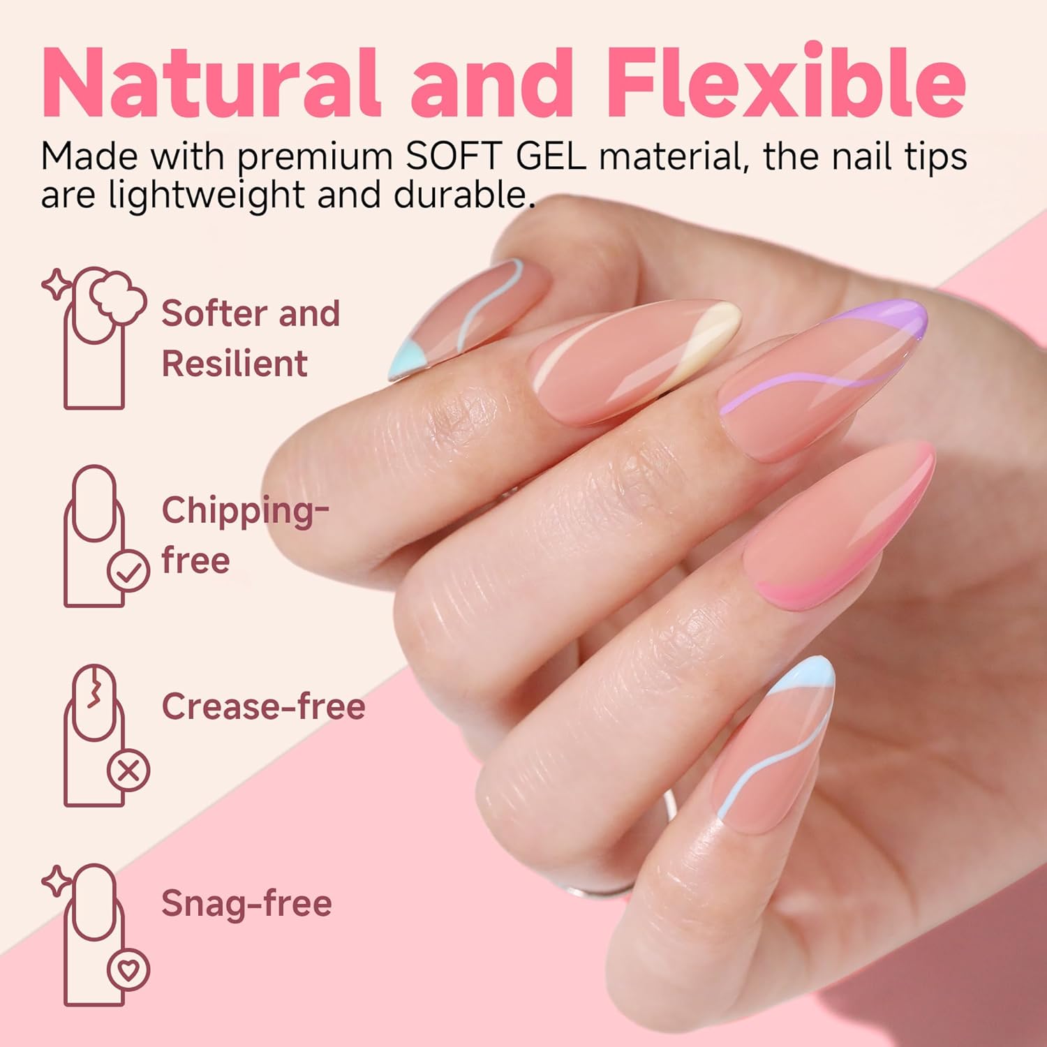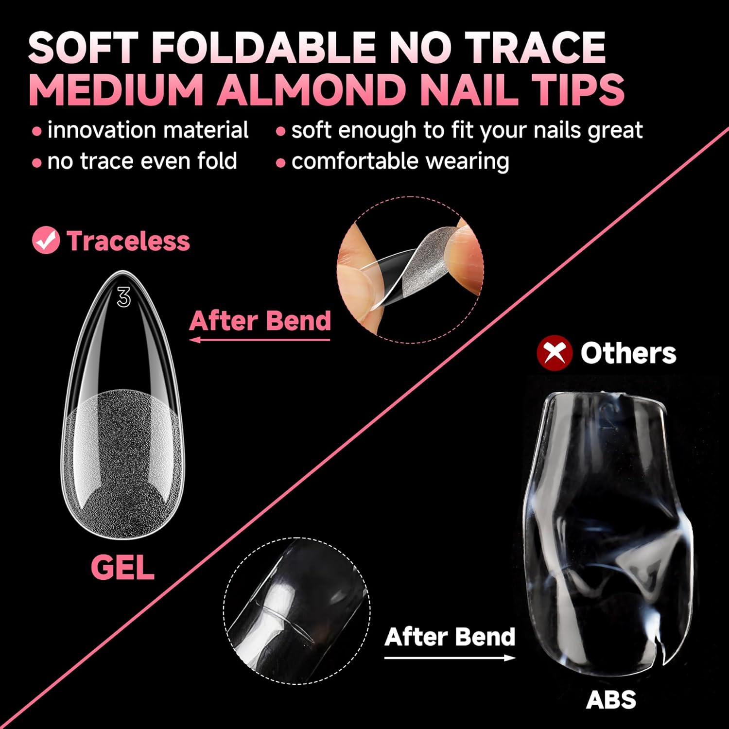 - Almond Nail Tips with No Trace The clear almond nail tips are gelly soft tips and will make no trace even bend. you can more easily press. trim. paint flat false nails to make your dream nails shape. Real DIY manicure gel tips.