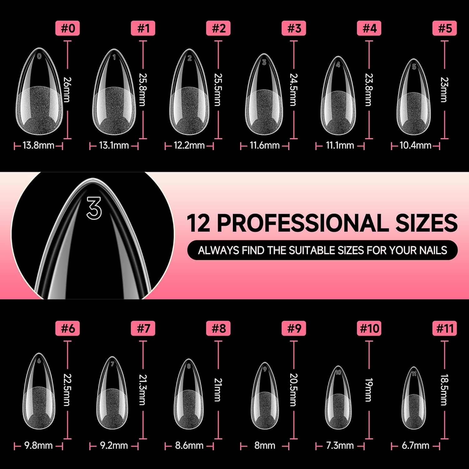 - 12 Sizes Tips Fit Your Nails Our clear almond tips contain 12 sizes with size number on the top of the tips can easy pick proper tips for your nail. And 2 extra size can suit bigger or smaller nails. in case 10size can not fit few of your nails.